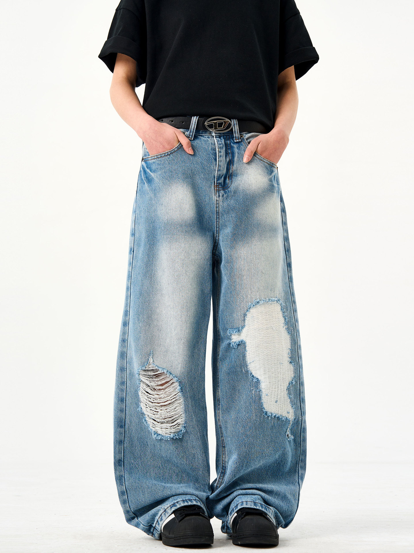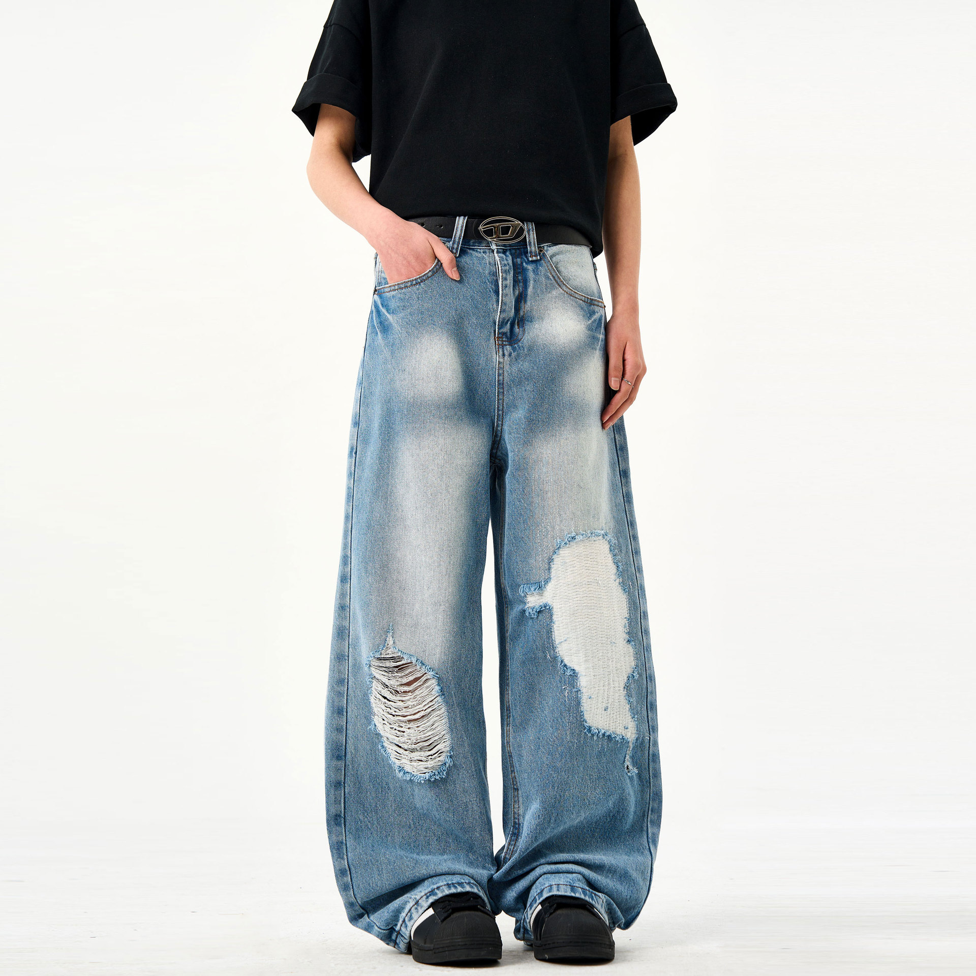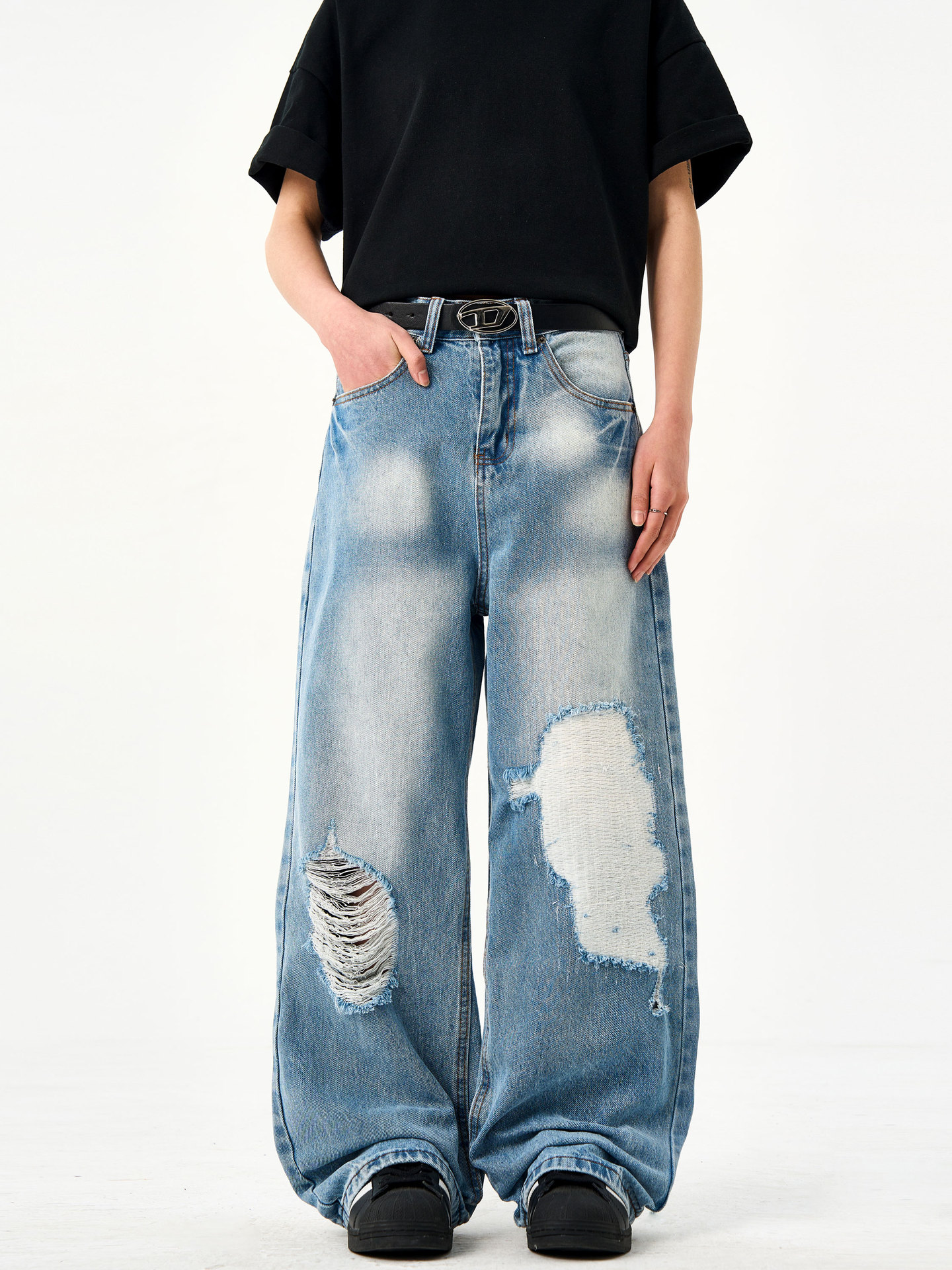 Be the first to review “Retro washed light blue ripped jeans for men and women in summer”