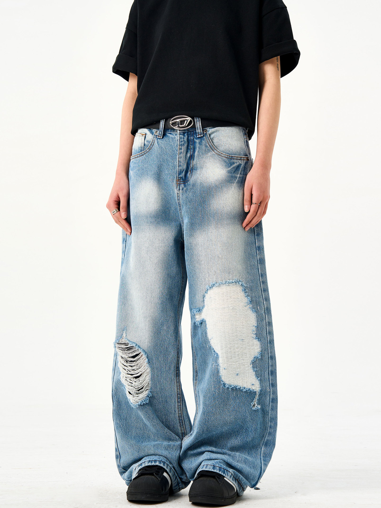 Retro washed light blue ripped jeans for men and women in summer